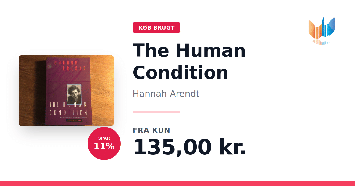Lige nu kan du købe "The Human Condition" af Hannah Arendt til kun 135,00 kr. Du sparer hele 11% af nyprisen! Bogen du ser her er brugt, og i perfekt stand. Vi har i øjeblikket kun et enkelt eksemplar til salg af "The Human Condition", så slå til mens du kan!
