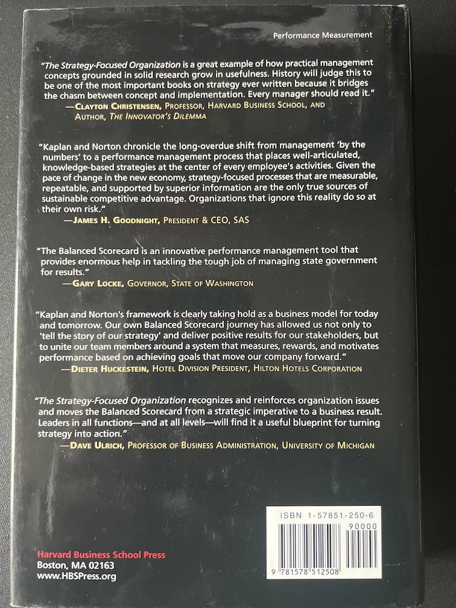 I The Strategy-Focused Organization præsenterer Robert S. Kaplan og David P. Norton - skaberne af det banebrydende Balanced Scorecard - en ny tilgang, hvor strategi bliver en kontinuerlig proces, ejet ikke kun af topledelsen, men af alle i organisationen. Bogen bygger på mere end ti års forskning i over 200 virksomheder og inddrager over 20 dybdegående casestudier, herunder Mobil, CIGNA og AT&T Canada. Forfatterne skitserer fem grundlæggende principper til at opbygge en strategifokuseret organisation: 1) omsæt strategien til operationelle mål, 2) tilpas organisationens struktur og processer til strategien, 3) gør strategi til alles daglige ansvar, 4) fasthold strategien som en løbende proces og 5) mobiliser forandring gennem stærk, effektiv ledelse. Gennem konkrete eksempler fra private, offentlige og nonprofit-organisationer viser Kaplan og Norton, hvordan implementering af disse principper kan skabe markante og varige præstationsforbedringer. Udgivet af Harvard Business Review Press i 2000.