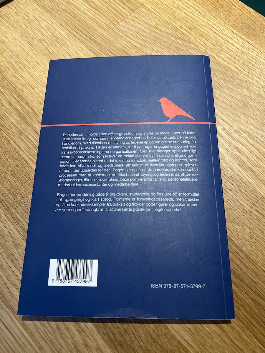 I en tid, hvor diskussioner om styring og ledelse i den offentlige sektor er i fokus, stiller bogen "Tillidsbaseret styring og ledelse i offentlige organisationer" skarpt på, hvad det vil sige at bygge organisationer på tillid. Bogen undersøger, hvordan tillidsbaserede metoder kan øge engagementet og reducere transaktionsomkostningerne, men samtidig peger den på de iboende risici og krav om balance mellem kontrol og frihed, der skal til for at omsætte ambitioner til praksis. Med et klart og tilgængeligt sprog henvender værket sig til både praktikere, studerende og forskere. Der tages udgangspunkt i forskningsbaserede pointer, som understøttes af konkrete eksempler fra den offentlige sektor og illustreres med figurer og sammendrag. Bogen belyser desuden de barrierer, der kan opstå, når nye tillidsbaserede styringsformer implementeres, samt de rolleændringer, der stilles til både politikere, forvaltningsmedarbejdere og ledere. Tina Øllgaard Bentzen udvider den teoretiske debat med ny indsigt og reflektion ud fra sine Ph.d.-studier ved Roskilde Universitet.