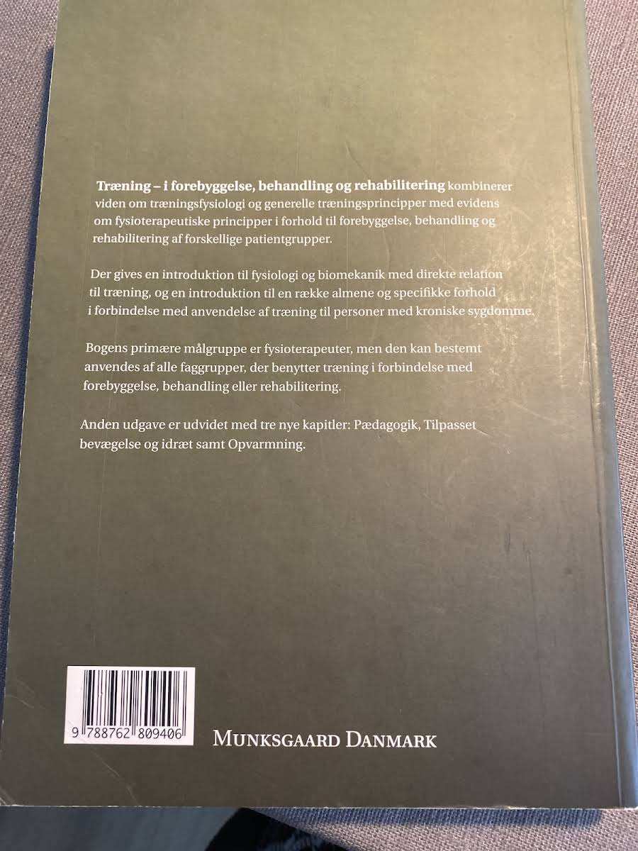 Med "Træning i forebyggelse, behandling og rehabilitering" præsenteres læseren for de fundamentale elementer inden for fysiologi og biomekanik med særligt fokus på træningsfysiologi og de grundlæggende principper bag træning. Bogen giver et solidt vidensgrundlag for, hvordan træning kan anvendes målrettet til forebyggelse, behandling og rehabilitering. Indholdet henvender sig primært til fysioterapeuter, men de anvendte principper og metoder er relevante for alle faggrupper, der arbejder med træning inden for de nævnte områder. Gennem praktiske eksempler og teoretiske indsigter inspireres læseren til en helhedsorienteret tilgang, hvor forebyggelse og rehabilitering vægtes lige stærkt.