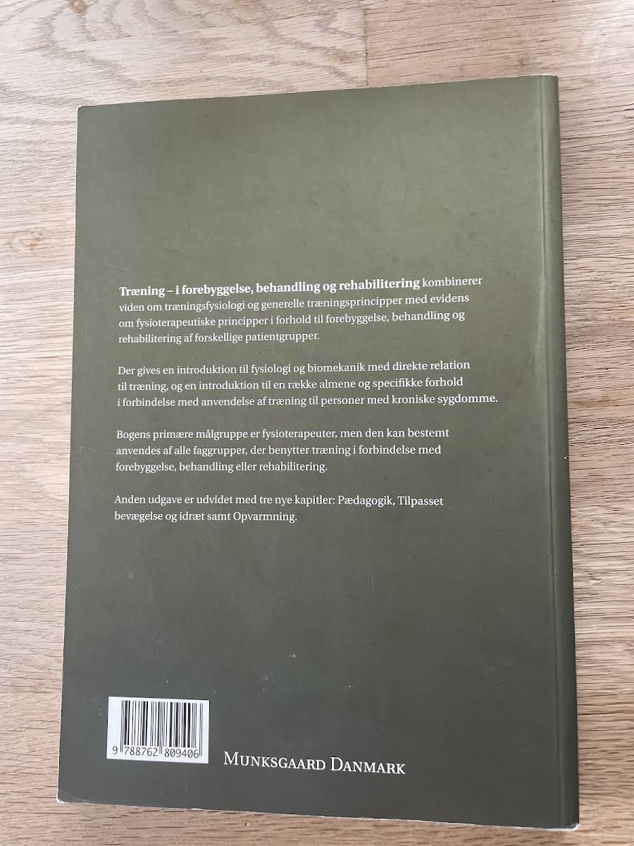 Med "Træning i forebyggelse, behandling og rehabilitering" præsenteres læseren for de fundamentale elementer inden for fysiologi og biomekanik med særligt fokus på træningsfysiologi og de grundlæggende principper bag træning. Bogen giver et solidt vidensgrundlag for, hvordan træning kan anvendes målrettet til forebyggelse, behandling og rehabilitering. Indholdet henvender sig primært til fysioterapeuter, men de anvendte principper og metoder er relevante for alle faggrupper, der arbejder med træning inden for de nævnte områder. Gennem praktiske eksempler og teoretiske indsigter inspireres læseren til en helhedsorienteret tilgang, hvor forebyggelse og rehabilitering vægtes lige stærkt.