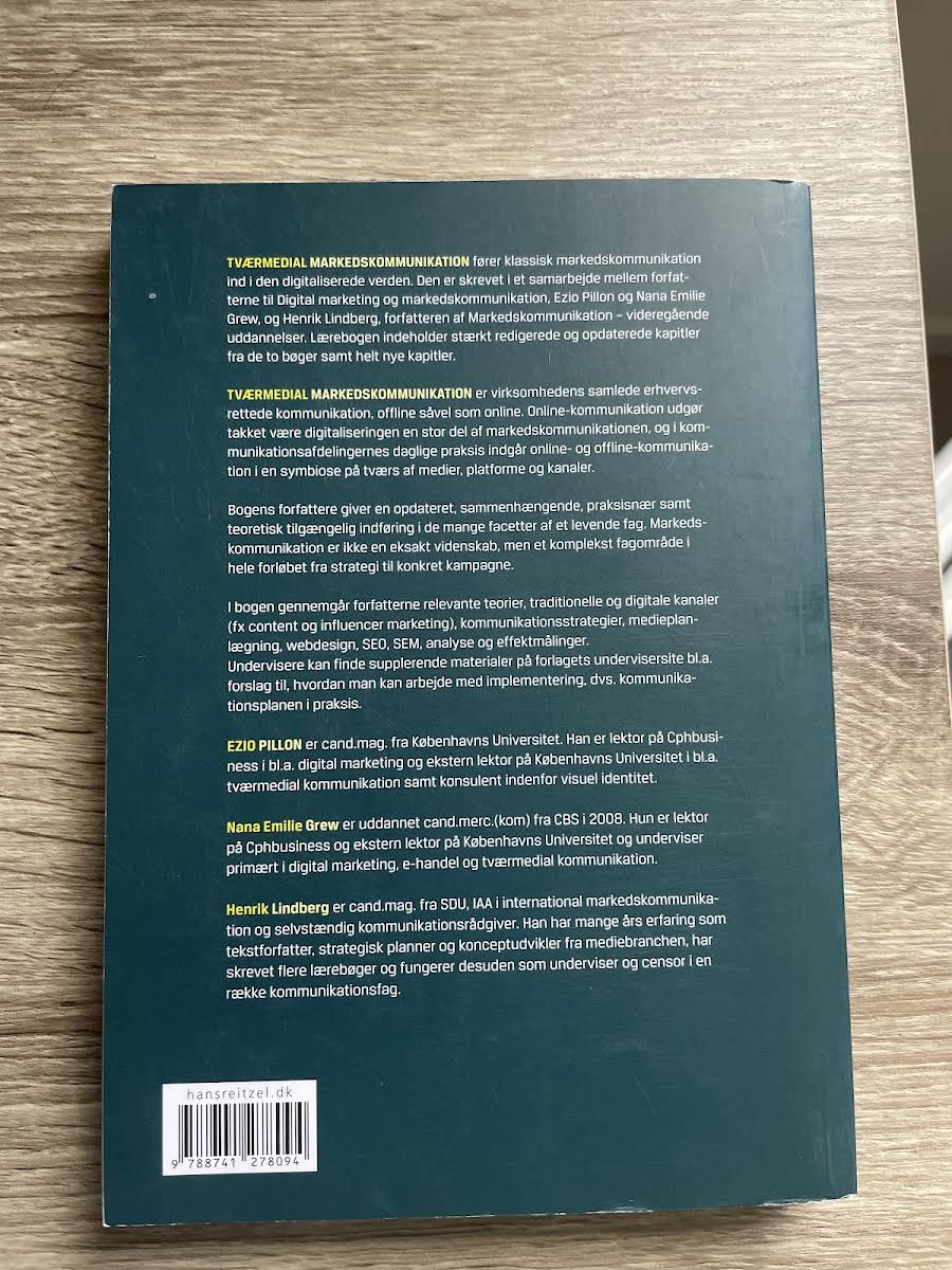 Tværmedial markedskommunikation bringer klassisk markedskommunikation ind i den digitale tidsalder og præsenterer en helhedsorienteret tilgang til virksomhedens kommunikationsindsats – både offline og online. Bogen forener opdaterede kapitler fra tidligere værker med helt nye perspektiver og illustrerer, hvordan medier, platforme og kanaler arbejder sammen i en dynamisk symbiose. Med et solidt teoretisk fundament og konkrete eksempler dykker forfatterne ned i alt fra kommunikationsstrategi og medieplanlægning til webdesign, SEO, SEM og effektmålinger. Indholdet afspejler en praksisnær tilgang, der gør det muligt at forstå og anvende teorierne i det virkelige arbejde med både traditionel og digital markedskommunikation. Forfatterne Ezio Pillon, Nana Emilie Grew og Henrik Lindberg, som alle besidder en indgående ekspertise inden for området, formår at gøre komplekse sammenhænge tilgængelige. Denne lærebog er et uundværligt redskab for studerende og undervisere på videregående uddannelser, der ønsker at få en dybdegående forståelse af, hvordan kommunikationen transformeres og optimeres i den moderne medieverden.