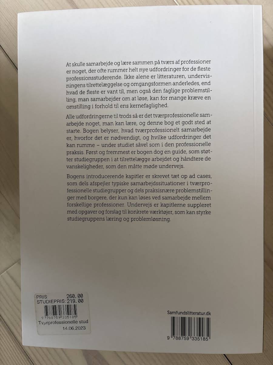 Tværprofessionelle studiegrupper udfordrer de traditionelle måder at arbejde og lære på, og stiller helt nye krav til de professionsstuderende. Denne bog giver en grundig introduktion til det tværprofessionelle samarbejde, hvor både litteratur, undervisningsmetoder og omgangsformer afviger fra det velkendte. Bogen forklarer, hvorfor samarbejdet på tværs af fagligheder er essentielt, og belyser de særlige udfordringer, der opstår, når man skal håndtere komplekse problemstillinger, som rækker ud over ens kernefag. Med udgangspunkt i praksisnære cases og konkrete eksempler, guider bogen studiegruppen gennem planlægning og problemløsning undervejs i samarbejdet. Kapitel efter kapitel præsenteres scenarier, der spejler både de typiske samarbejdssituationer og de unikke problemstillinger, som studerende og fagfolk møder i den virkelige verden. Gennem opgaver og forslag til praktiske værktøjer bliver læseren rustet til at navigere i de udfordringer og muligheder, der ligger i et tværprofessionelt samarbejde.
