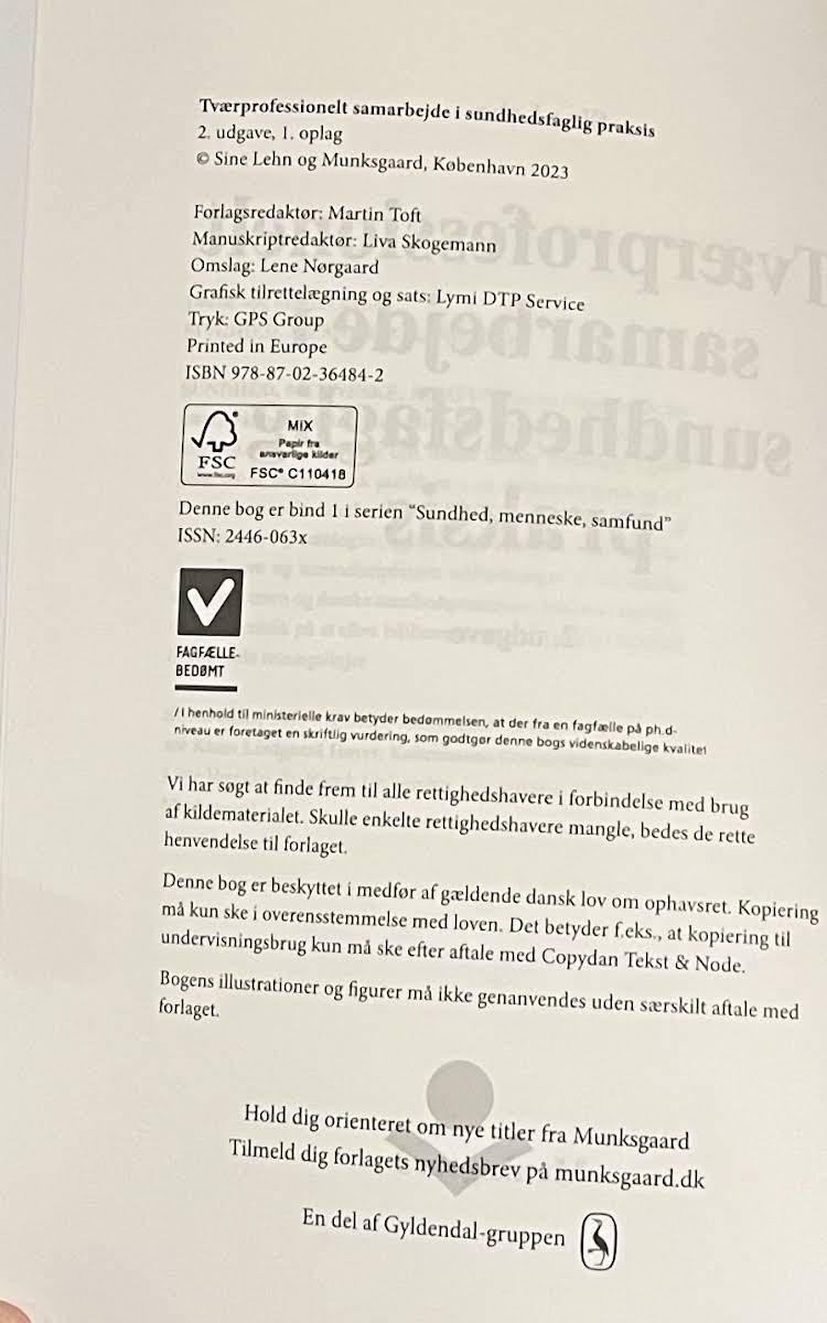 Tværprofessionelt samarbejde i sundhedsfaglig praksis byder på en grundig introduktion til, hvordan samarbejdet mellem forskellige sundhedsprofessioner styrkes i det danske sundhedsvæsen. Bogen undersøger de faglige og institutionelle dynamikker, der præger tværprofessionelt arbejde, og viser, hvordan en dybere forståelse af disse rammer kan bidrage til et sammenhængende patient- og borgerforløb. I denne 2. udgave fra 2023, skriver cand.mag. og ph.d. Sine Lehn med et skarpt blik på samtiden. Blandt andet indeholder bogen to nye kapitler, der belyser Covid-19-epidemiens indflydelse på samarbejdsprocesserne samt lægernes og uddannelsessystemets rolle i udviklingen af det tværprofessionelle samarbejde. Med velskrevne analyser af illustrative praksiseksempler præsenteres både udfordringer og løsningsforslag, som giver læseren et solidt fagligt fundament. Udgivet af Munksgaard og med en pædagogisk tilgang, er denne bog et værdifuldt redskab for både studerende, praktikere og ledere i sundhedssektoren, der ønsker at fremme et velfungerende og kvalitetsbevidst tværprofessionelt samarbejde.