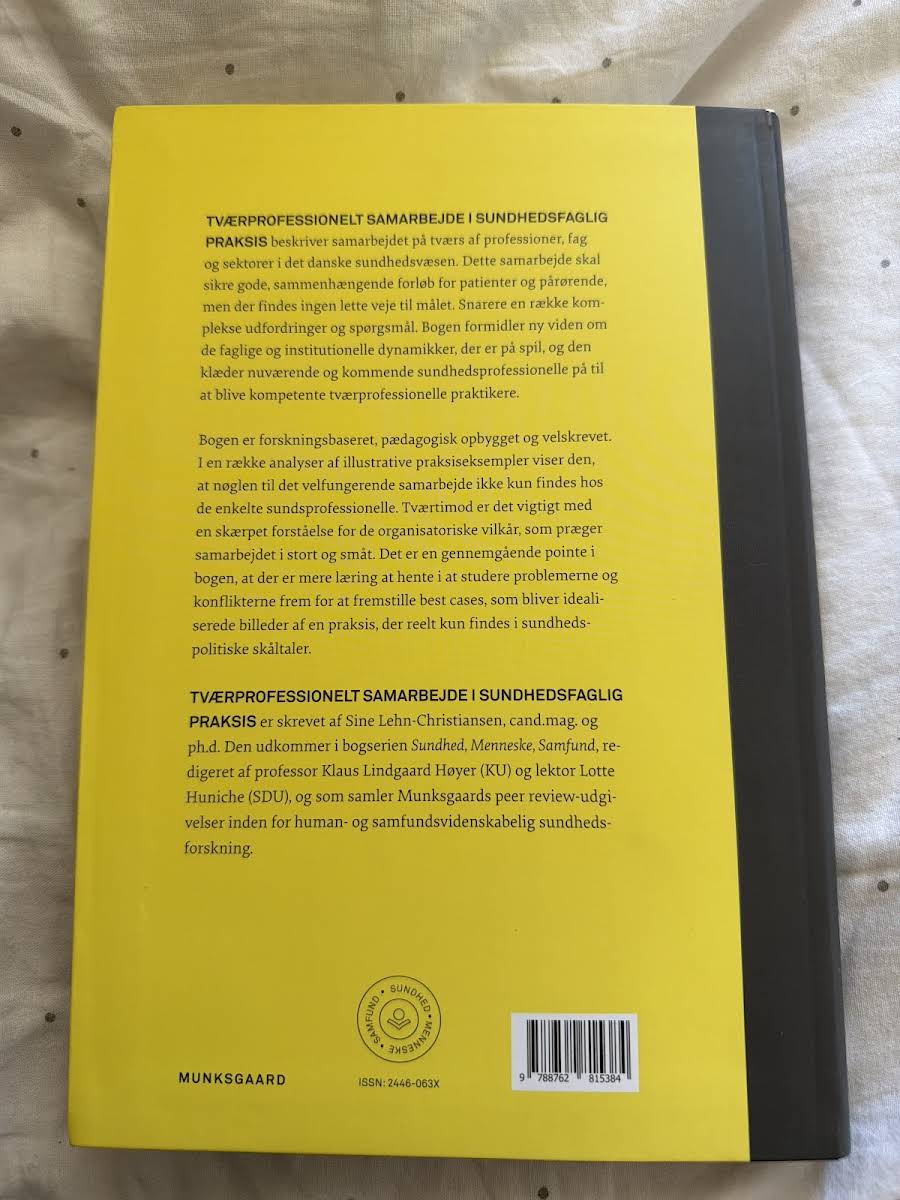 I "Tværprofessionelt samarbejde i sundhedsfaglig praksis" tager Sine Lehn-Christiansen, cand.mag. og ph.d., udgangspunkt i de komplekse og ofte udfordrende betingelser for samarbejde på tværs af sundhedsprofessioner. Med udgangspunkt i en række analyser af praksiseksempler belyser bogen, hvordan både faglige og organisatoriske dynamikker spiller sammen og påvirker patientforløb i det danske sundhedsvæsen. Gennem en kritisk gennemgang af samarbejdets realiteter understreges, at forbedringer ikke kun opnås gennem enkeltspecialisters indsats, men også ved at forstå og tilpasse de institutionelle rammer. Med et solidt teoretisk og empirisk fundament styrker bogen nuværende og kommende sundhedsprofessionelle evnen til at navigere i og udvikle tværprofessionelle praksisser.