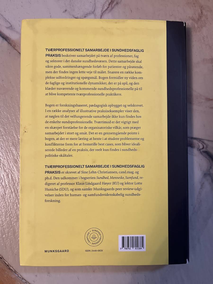 I "Tværprofessionelt samarbejde i sundhedsfaglig praksis" tager Sine Lehn-Christiansen, cand.mag. og ph.d., udgangspunkt i de komplekse og ofte udfordrende betingelser for samarbejde på tværs af sundhedsprofessioner. Med udgangspunkt i en række analyser af praksiseksempler belyser bogen, hvordan både faglige og organisatoriske dynamikker spiller sammen og påvirker patientforløb i det danske sundhedsvæsen. Gennem en kritisk gennemgang af samarbejdets realiteter understreges, at forbedringer ikke kun opnås gennem enkeltspecialisters indsats, men også ved at forstå og tilpasse de institutionelle rammer. Med et solidt teoretisk og empirisk fundament styrker bogen nuværende og kommende sundhedsprofessionelle evnen til at navigere i og udvikle tværprofessionelle praksisser.