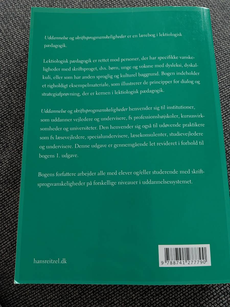 "Uddannelse og skriftsprogsvanskeligheder" er en lærebog, der præsenterer lektiologisk pædagogik – en tilgang målrettet personer med udfordringer med skriftsproget, herunder børn, unge og voksne med dysleksi, dyskalkuli eller anden sproglig og kulturel baggrund. Bogen byder på et rigt eksempelmateriale, der tydeligt illustrerer de centrale principper for dialog og strategiafprøvning, som er fundamentet for metoden. Bogen henvender sig både til institutioner, der uddanner vejledere og undervisere, som fx professionshøjskoler, kursusudbydere og universiteter, og til de praktikere, der arbejder direkte med elever og studerende med skriftsprogsvanskeligheder. Bl.a. læsevejledere, specialundervisere, læsekonsulenter, studievejledere og undervisere kan finde inspiration og konkrete redskaber i denne faglige ressource, hvor forfatterne alle bidrager med deres vigtige erfaringer fra den forskellige niveauer af uddannelsessystemet.