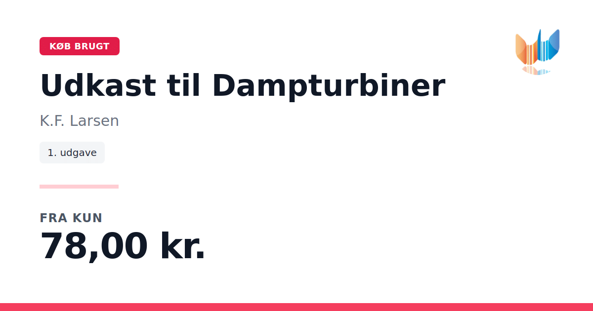 Lige nu kan du købe "Udkast til Dampturbiner" af K.F. Larsen til kun 78,00 kr. Bogen du ser her er brugt, og i god stand. Vi har i øjeblikket kun et enkelt eksemplar til salg af "Udkast til Dampturbiner", så slå til mens du kan!