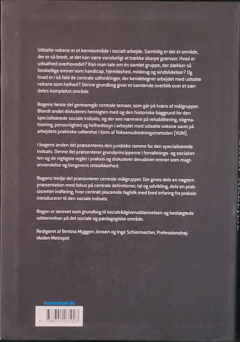 "Udsatte voksne og socialt arbejde" er en grundbog, der giver et bredt og nuanceret overblik over arbejdet med udsatte voksne – et område præget af stor mangfoldighed og komplekse problemstillinger. Hvad indebærer udsathed, og hvordan forenes emner som handicap, hjemløshed, misbrug og psykiske lidelser under én faglig paraply? Bogen åbner for disse spørgsmål og sætter scenen for en dybdegående diskussion om de teoretiske og praktiske aspekter af arbejdet med samfundets mest sårbare grupper. I første del præsenteres centrale temaer, der rækker på tværs af målgrupper og belægger den specialiserede sociale indsats historisk og praktisk. Anden del lægger vægt på den juridiske ramme, med en gennemgang af socialrettens grundprincipper, herunder emner som magtanvendelse og borgernes retssikkerhed. Endelig belyser den tredje del specifikke målgrupper gennem både nøgterne definitioner og praksisnære indsigter fra erfarne fagfolk. Samlet set tilbyder "Udsatte voksne og socialt arbejde" et solidt fundament for studerende og praktikere inden for social- og pædagogisk arbejde.