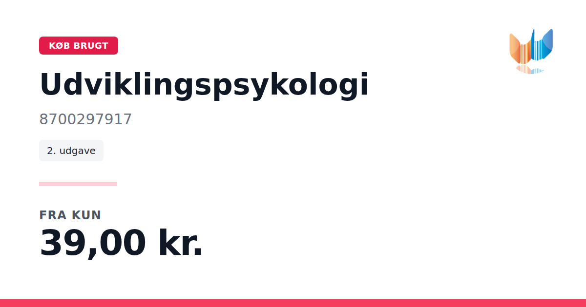 Lige nu kan du købe "Udviklingspsykologi " af 8700297917 til kun 39,00 kr. Bogen du ser her er brugt, og i slidt stand. Vi har i øjeblikket kun et enkelt eksemplar til salg af "Udviklingspsykologi ", så slå til mens du kan!