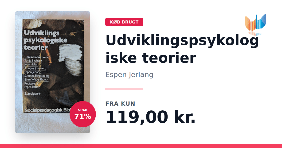 Lige nu kan du købe "Udviklingspsykologiske teorier" af Espen Jerlang til kun 119,00 kr. Du sparer hele 71% af nyprisen! Bogen du ser her er brugt, og i god stand. Vi har i øjeblikket 10 eksemplarer til salg af "Udviklingspsykologiske teorier", så husk at se de forskellige udgaver.