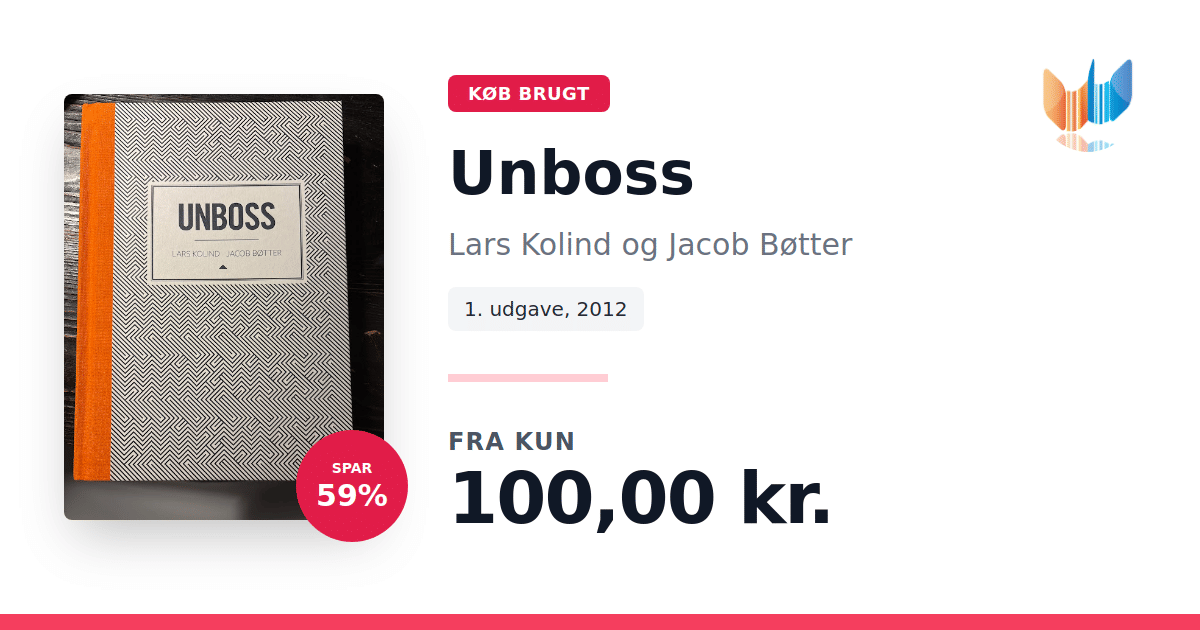 Lige nu kan du købe "Unboss" af Lars Kolind og Jacob Bøtter til kun 100,00 kr. Du sparer hele 59% af nyprisen! Bogen du ser her er brugt, og i slidt stand. Vi har i øjeblikket 2 eksemplarer til salg af "Unboss", så husk at se de forskellige udgaver.