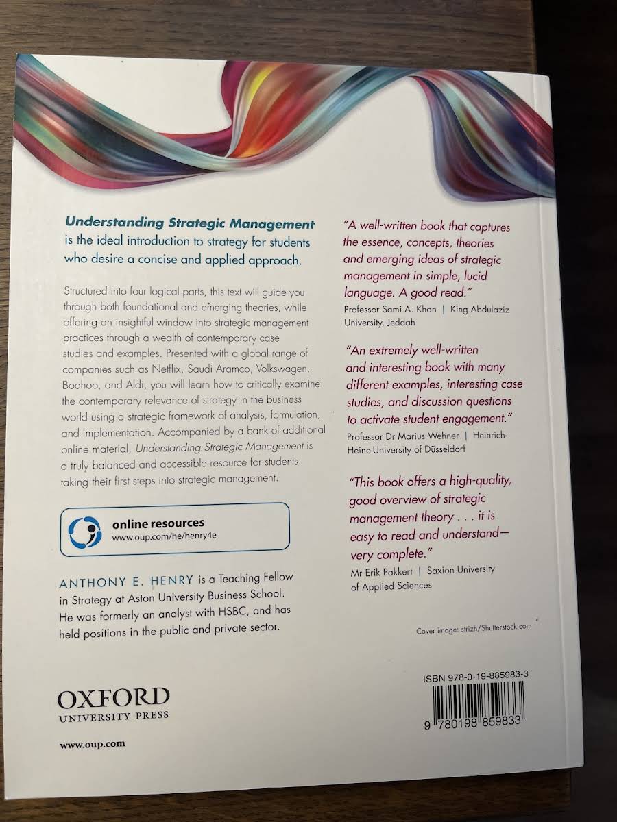 Understanding Strategic Management giver en klar og praktisk introduktion til strategisk ledelse med en fire-delt struktur, der først definerer selve strategibegrebet og derefter anvender den overordnede ramme bestående af analyse, formulering og implementering. Gennem denne tilgang viser bogen, hvordan virksomheder kan udvikle og opretholde en bæredygtig konkurrencefordel. Anthony Henry illustrerer strategiens virkelighed med mangfoldige, internationale og nutidige eksempler, mens "Strategy in Focus"-bokse trækker tråde til populære mediehændelser. Hvert kapitel byder desuden på en indlejret, sammenhængende case, som samler flere strategiske udfordringer for både store og små, private og offentlige organisationer. Review- og diskussionsspørgsmål motiverer de studerende til kritisk tænkning og til at sammenligne alternative modeller og metoder. Studerende kan udbygge deres forståelse via online-ressourcer, der er nøje udvalgt af forfatteren. Hvert kapitel henviser til yderligere Extension Material for fordybelse i specifikke emner, og multiple choice-spørgsmål i slutningen af kapitlerne giver mulighed for at teste viden og indsigt. Den afbalancerede struktur, omfattende eksempler og de ekstra materialer gør denne fjerde udgave til et solidt og tilgængeligt udgangspunkt for alle, der tager deres første skridt ind i strategisk ledelse. Supplerende online-ressourcer omfatter for studerende: internetsøvelser, glosar, extension-materiale, Working through Strategy, multiple choice-spørgsmål og yderligere anbefalede ressourcer. For undervisere: casebank, diskussionsspørgsmål og -prompter, testbank, yderligere casemateriale, svar til diskussionsspørgsmål, PowerPoint-slides samt figurer og tabeller fra bogen.