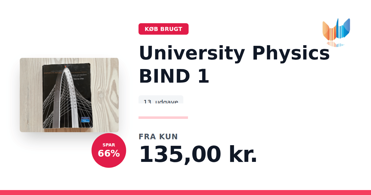 Lige nu kan du købe "University Physics BIND 1" til kun 135,00 kr. Du sparer hele 66% af nyprisen! Bogen du ser her er brugt, og i god stand. Vi har i øjeblikket 2 eksemplarer til salg af "University Physics BIND 1", så husk at se de forskellige udgaver.
