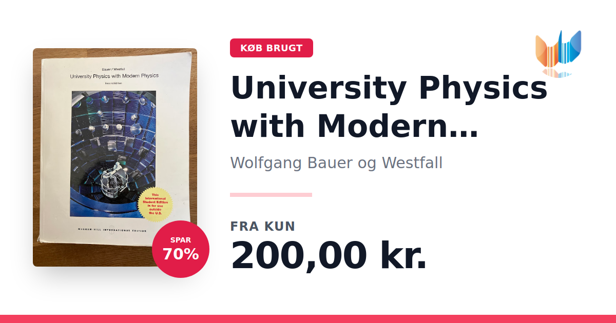 Lige nu kan du købe "University Physics with Modern Physics" af Wolfgang Bauer og Westfall til kun 200,00 kr. Du sparer hele 70% af nyprisen! Bogen du ser her er brugt, og i slidt stand. Vi har i øjeblikket kun et enkelt eksemplar til salg af "University Physics with Modern Physics", så slå til mens du kan!