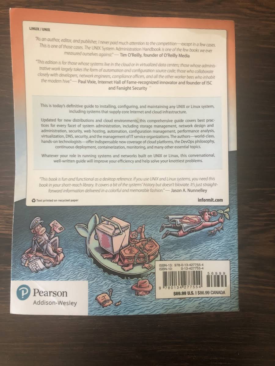 • UNIX and Linux System Administration Handbook, Evi Nemeth, Garth Snyder, Trent Hein, Ben Whaley, Dan Mackin, 9780134277554