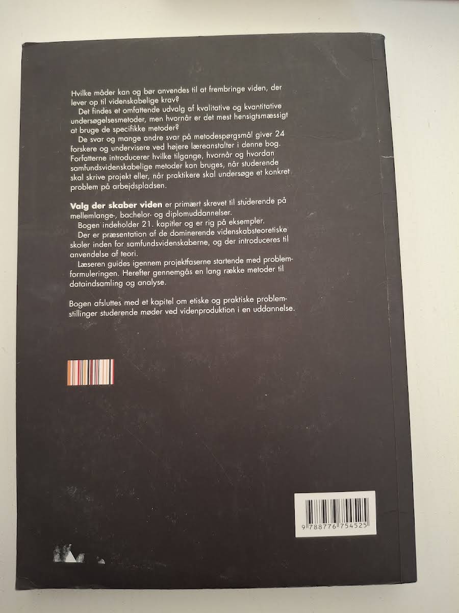 Hvordan sikrer vi, at de valgte metoder lever op til de videnskabelige krav? I Valg der skaber viden – om samfundsvidenskabelige metoder præsenteres en række tilgange til både kvalitative og kvantitative undersøgelser, som giver læseren redskaberne til at vælge den mest hensigtsmæssige metode i forhold til konkrete problemstillinger. Med bidrag fra 24 forskere og undervisere, gives et solidt indblik i, hvordan teori og praksis mødes gennem eksempler og konkrete metoder. Bogen henvender sig primært til studerende på mellemlange-, diplom- og bacheloruddannelser, der skal udforme projekter, hvor videnskabelighed og metodisk stringens vægtes højt. Gennem 21 kapitler følges projektets faser fra den indledende problemformulering til dataindsamling og analyse, idet de dominerende videnskabsteoretiske skoler præsenteres i en letforståelig kontekst. Derudover berøres de etiske og praktiske udfordringer, som kan opstå i arbejdets proces. Valg der skaber viden giver dermed en struktureret tilgang til forståelsen af samfundsvidenskabelige metoder og bidrager til at styrke den studerendes evne til kritisk analyse og refleksion.