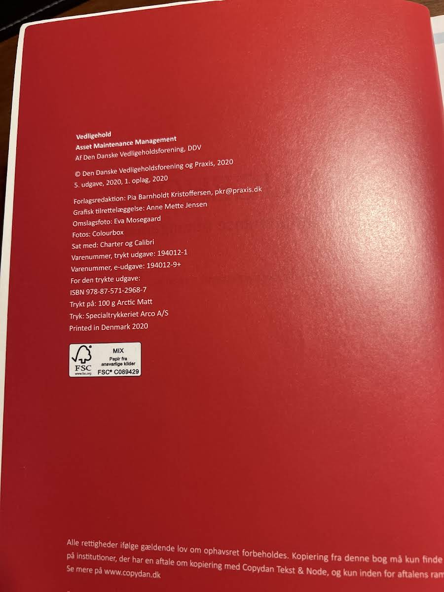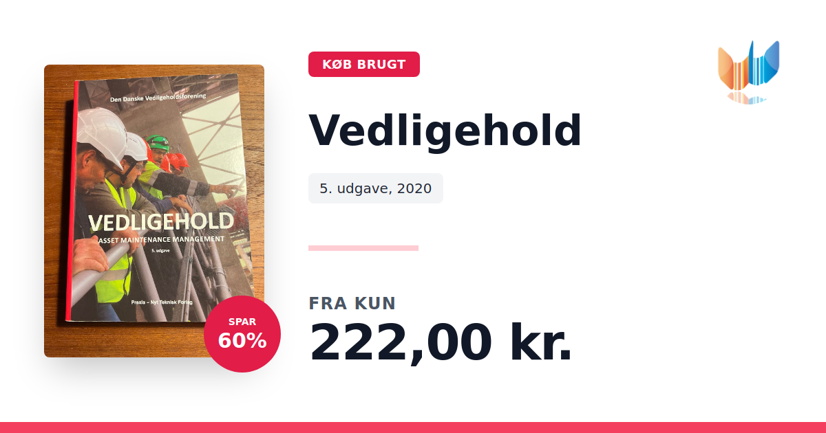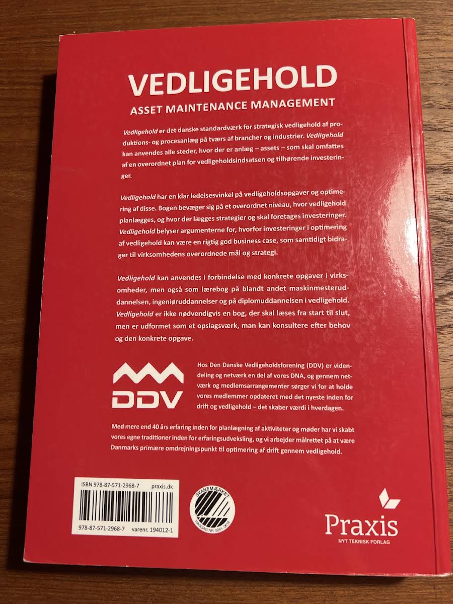 Vedligehold er et centralt værktøj inden for strategisk asset management, der retter sig mod vedligehold af produktions- og procesanlæg på tværs af brancher. Bogen skitserer, hvordan en samlet vedligeholdelsesstrategi og investeringstilgang kan planlægges og implementeres med ledelsesmæssigt overblik. Med sin klare ledelsesvinkel giver Vedligehold læseren indsigt i, hvordan optimering af vedligeholdsprocesser bidrager til virksomhedens samlede mål og strategi. Bogen fungerer både som oplagt opslagsværk i konkrete virksomheder og som faglitteratur på uddannelsesinstitutioner såsom maskinmester-, ingeniør- og diplomuddannelser i vedligehold. Med sine 488 sider fra Praxis, udgivet i 2020, er Vedligehold en uundværlig ressource for alle, der beskæftiger sig med vedligehold af anlæg.