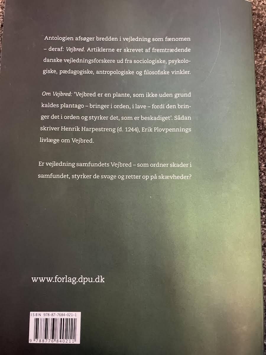 Vejbred er en antologi, der udforsker vejledningsfænomenet fra flere discipliner. Bogen samler artikler af anerkendte danske vejledningsforskere, der med udgangspunkt i sociologiske, psykologiske, pædagogiske, antropologiske og filosofiske perspektiver skuer på, hvordan vejledning kan påvirke både individ og samfund. Med titlen inspireret af den naturlige plante, plantago, peger bogen på, hvordan vejledning både ordner og styrker dem, der har lidt skade. Kan vejledningen ses som samfundets eget Vejbred – et middel til at rette op på ubalancer og give de svage støtte? Vejbred byder på refleksioner, der både udfordrer og oplyser læseren om vejledningens potentiale.