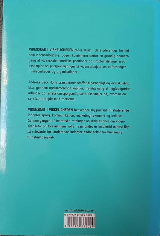 Videnskab i virkeligheden - En grundbog i videnskabsteori præsenterer de fundamentale videnskabsteoretiske positioner i et klart og overskueligt sprog. Andreas Beck Holm kobler klassiske og moderne teorier med eksempler fra virksomheder og organisationer, så læseren kan se, hvordan teorierne spiller sammen med praksis. Gennem opsummerende kapitler skabes et hurtigt overblik, mens fremhævede nøglebegreber sikrer, at de vigtigste pointer står skarpt. Hvert kapitel afsluttes med arbejds- og refleksionsspørgsmål, der udfordrer til aktiv fordybelse og selvstændig anvendelse af stoffet. Bogen henvender sig til studerende og kommende vidensarbejdere, der ønsker et solidt teoretisk fundament til både akademiske og professionelle opgaver. Hardcover, 257 sider. Udkom på Samfundslitteratur i 2011 som 1. udgave.