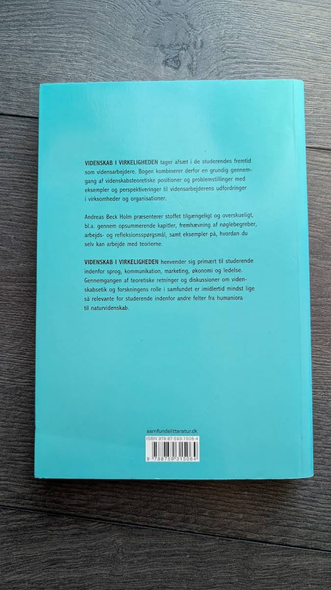 Videnskab i virkeligheden - En grundbog i videnskabsteori præsenterer de fundamentale videnskabsteoretiske positioner i et klart og overskueligt sprog. Andreas Beck Holm kobler klassiske og moderne teorier med eksempler fra virksomheder og organisationer, så læseren kan se, hvordan teorierne spiller sammen med praksis. Gennem opsummerende kapitler skabes et hurtigt overblik, mens fremhævede nøglebegreber sikrer, at de vigtigste pointer står skarpt. Hvert kapitel afsluttes med arbejds- og refleksionsspørgsmål, der udfordrer til aktiv fordybelse og selvstændig anvendelse af stoffet. Bogen henvender sig til studerende og kommende vidensarbejdere, der ønsker et solidt teoretisk fundament til både akademiske og professionelle opgaver. Hardcover, 257 sider. Udkom på Samfundslitteratur i 2011 som 1. udgave.