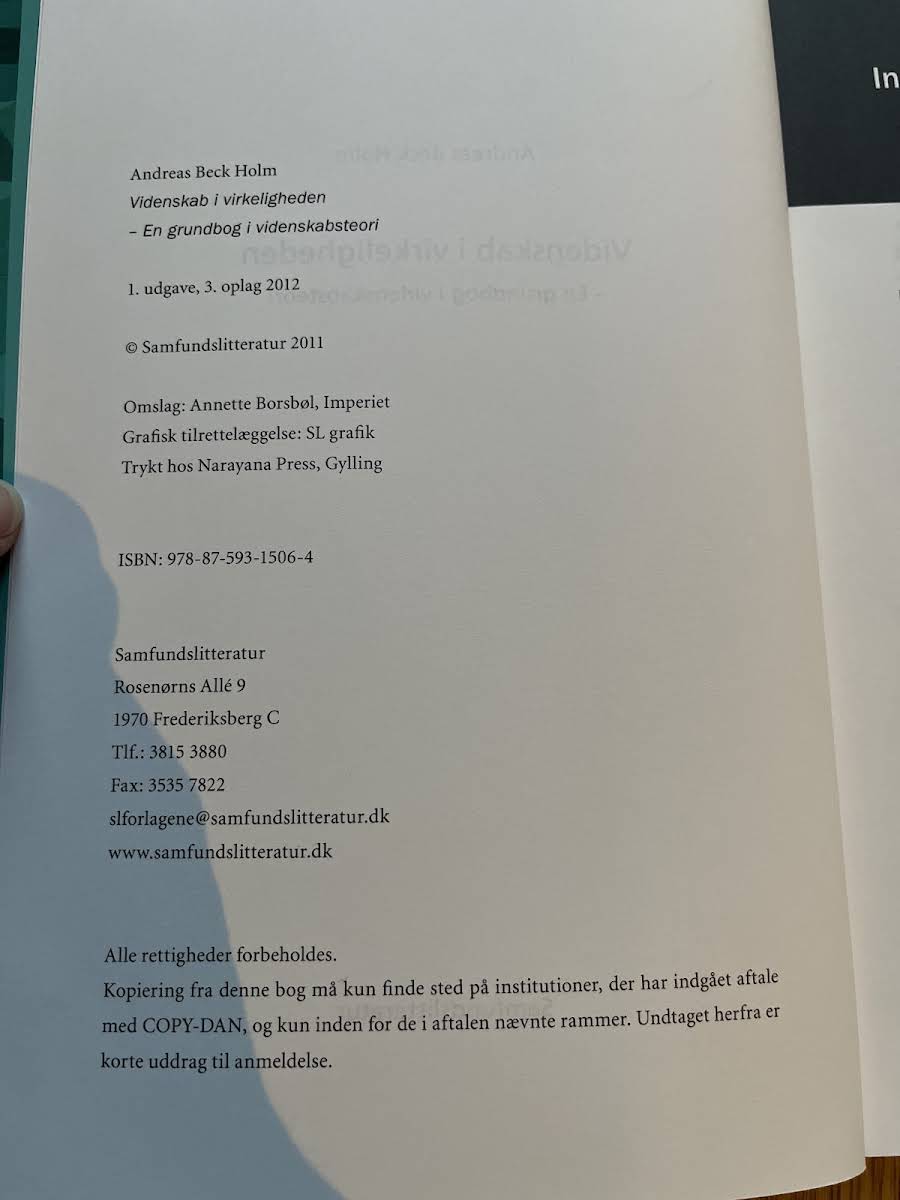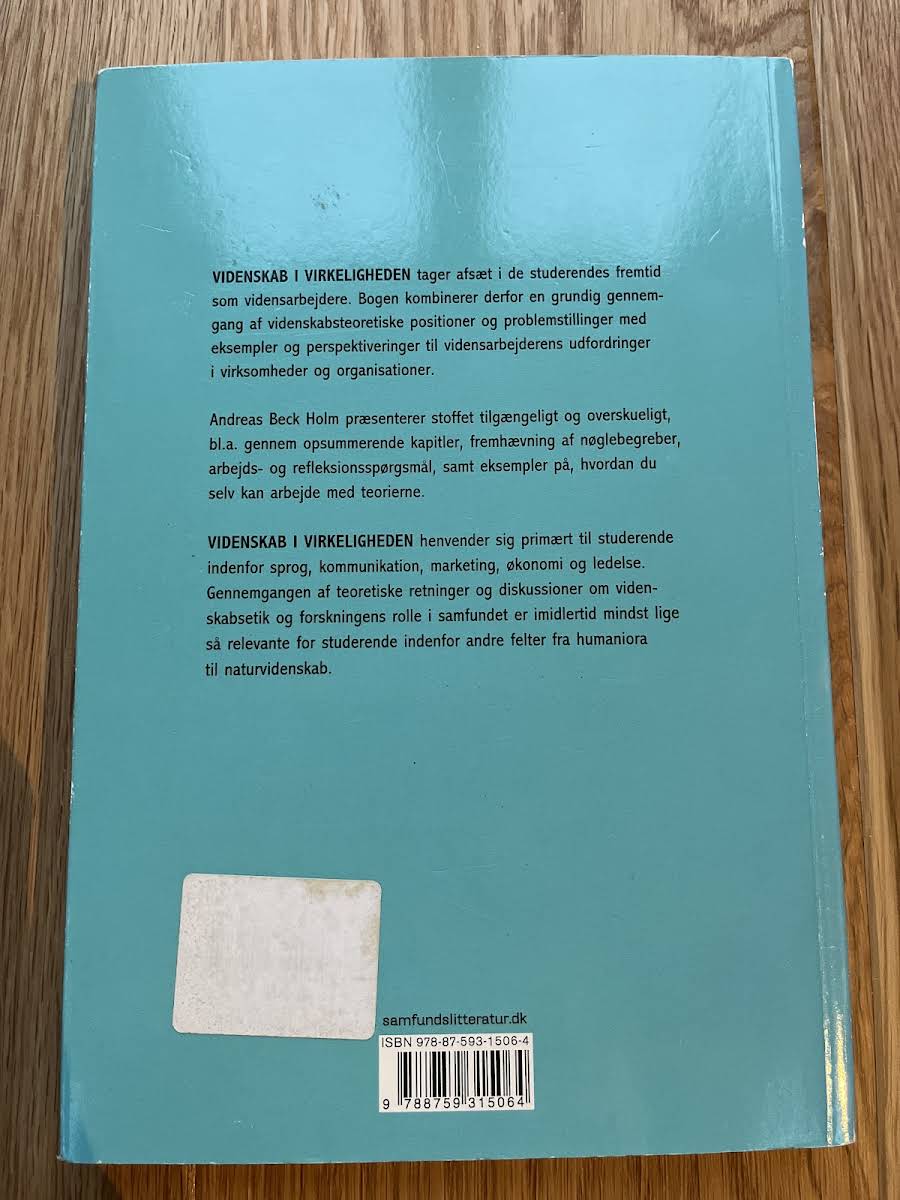 Videnskab i virkeligheden - En grundbog i videnskabsteori præsenterer de fundamentale videnskabsteoretiske positioner i et klart og overskueligt sprog. Andreas Beck Holm kobler klassiske og moderne teorier med eksempler fra virksomheder og organisationer, så læseren kan se, hvordan teorierne spiller sammen med praksis. Gennem opsummerende kapitler skabes et hurtigt overblik, mens fremhævede nøglebegreber sikrer, at de vigtigste pointer står skarpt. Hvert kapitel afsluttes med arbejds- og refleksionsspørgsmål, der udfordrer til aktiv fordybelse og selvstændig anvendelse af stoffet. Bogen henvender sig til studerende og kommende vidensarbejdere, der ønsker et solidt teoretisk fundament til både akademiske og professionelle opgaver. Hardcover, 257 sider. Udkom på Samfundslitteratur i 2011 som 1. udgave.