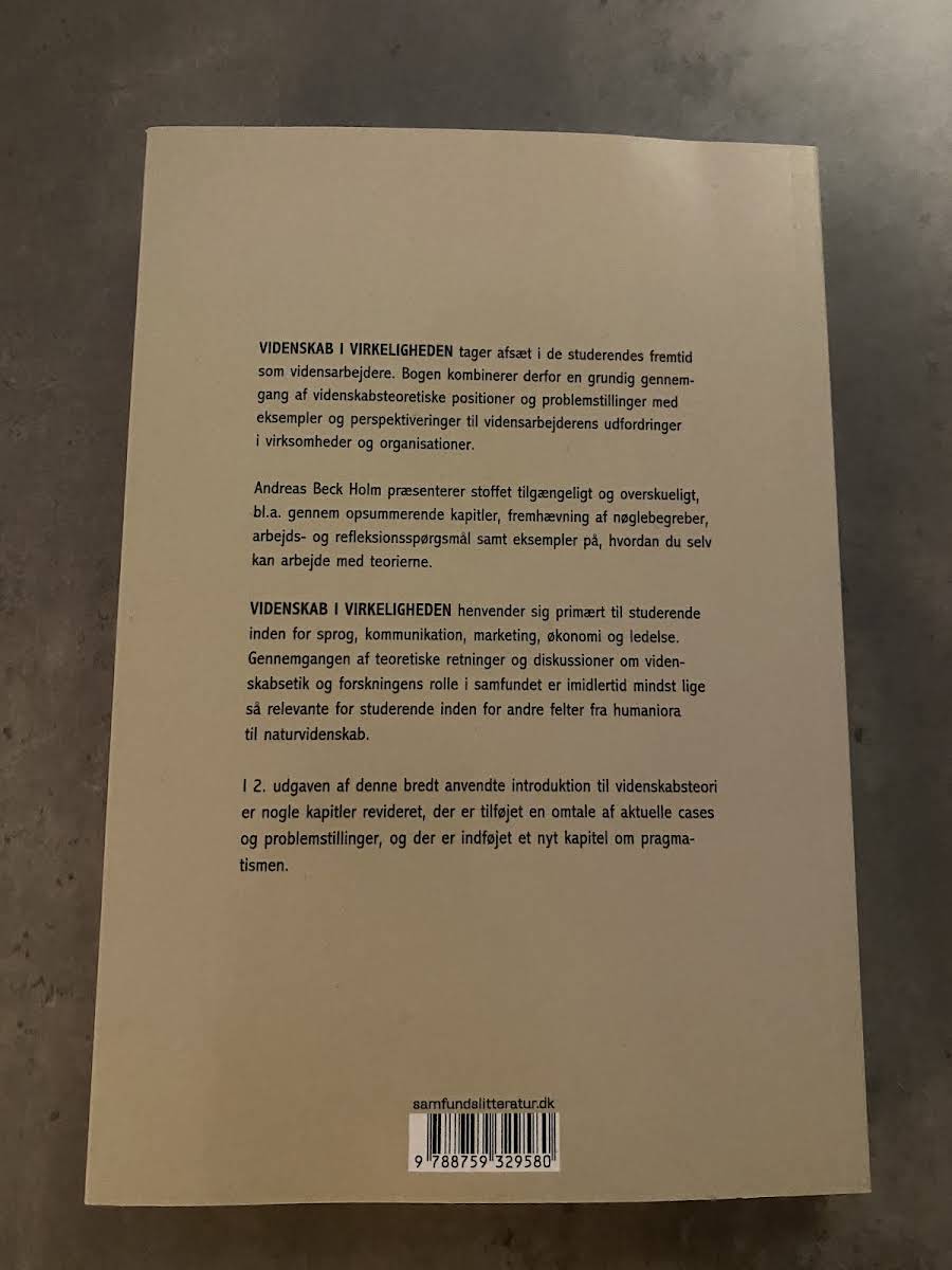 Videnskab i virkeligheden er en nøje udtænkt introduktion til videnskabsteori, designet til at ruste studerende til fremtidens udfordringer som vidensarbejdere. Andreas Beck Holm præsenterer en systematisk gennemgang af centrale videnskabsteoretiske positioner og problemstillinger, hvor han væver teoretiske begreber sammen med praktiske perspektiver på, hvordan disse teorier fungerer i erhvervslivet og i organisationer. I 2. udgave af denne anerkendte lærebog er flere kapitler blevet opdateret for at afspejle moderne cases og aktuelle udfordringer. Bogen er struktureret med opsummerende afsnit, fremhævede nøglebegreber samt arbejds- og refleksionsspørgsmål, som tilsammen skaber et klart og tilgængeligt læringsredskab. Et vigtigt nyt kapitel om pragmatismen bidrager med friske indsigter, der understøtter forbindelsen mellem teori og praksis i studier af videnskab.