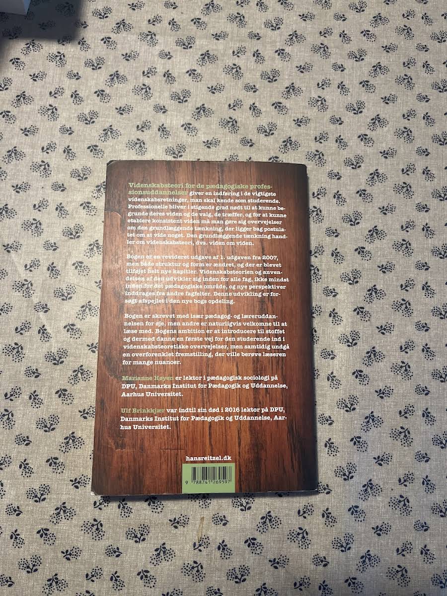Videnskabsteori for de pædagogiske professionsuddannelser giver en grundig og lettilgængelig indføring i de videnskabsteoretiske retninger, som er centrale for studerende på de pædagogiske professionsuddannelser. Viden fremstilles ikke som noget objektivt givet, men forstås som forankret i historiske og kulturelle kontekster. Bogen fungerer som en værktøjskasse, der klæder de studerende på til bevidst at reflektere over de spørgsmål, de skal stille, både når de møder viden fra andre og i deres eget forsknings- og skrivearbejde. Hvert kapitel indeholder konkrete eksempler fra pædagogisk praksis, som illustrerer videnskabsteoriens centrale pointer. Denne 2. udgave fra 2018 er gennemgribende revideret og udvidet med flere nye kapitler, der understøtter de studerendes forståelse af sammenhængen mellem teori og praksis. Om førsteudgaven skrev anmelderne: "… en tilgængelig introduktion til et svært emne" "… en hurtig, nem og elementær indføring i videnskabsteori" "… en introducerende, men ikke alt for forenklet fremstilling af, hvad videnskabsteori er […] bogen er velskrevet og godt disponeret" Marianne Høyen er uddannet ingeniør, cand.mag. i pædagogik og ph.d. og ansat som lektor i pædagogisk sociologi på DPU, Danmarks Institut for Pædagogik og Uddannelse, Aarhus Universitet. Ulf Brinkkjær var lektor på samme institut indtil sin død i 2016.