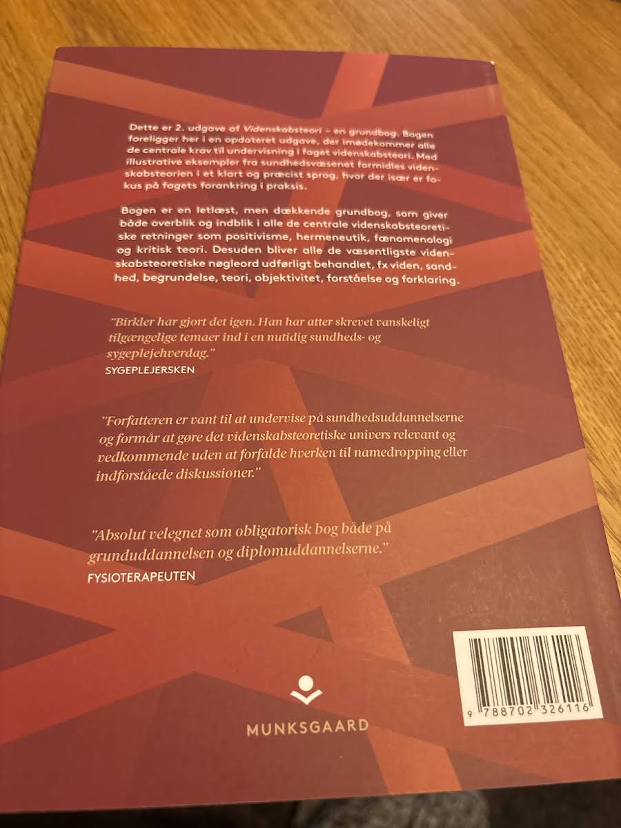 Dette er 2. udgave af Videnskabsteori – en grundbog, der tilbyder en opdateret tilgang til fagets kerneområder. Bogen er designet med henblik på undervisning i videnskabsteori og formidler centrale begreber og teorier med et klart og præcist sprog. Med illustrative eksempler, særligt fra sundhedsvæsenet, understreges videnskabsteoriens forankring i den praktiske virkelighed. Bogen giver læseren både overblik og dybdegående indsigt i retninger som positivisme, hermeneutik, fænomenologi og kritisk teori, samt behandler nøglebegreber som viden, sandhed, begrundelse, teori, objektivitet, forståelse og forklaring på en lettilgængelig måde.