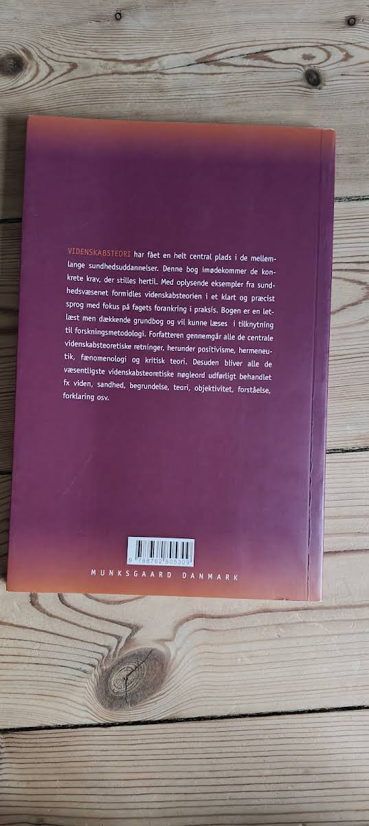 Bogen er en grundbog i videnskabsteori, der især henvender sig til studerende på mellemlange sundhedsuddannelser. Den behandler centrale videnskabsteoretiske retninger som positivisme, hermeneutik, fænomenologi og kritisk teori. Bogen forklarer nøglebegreber som viden, sandhed, objektivitet og forklaring med eksempler fra sundhedsvæsenet. Den er udgivet af Munksgaard Danmark.