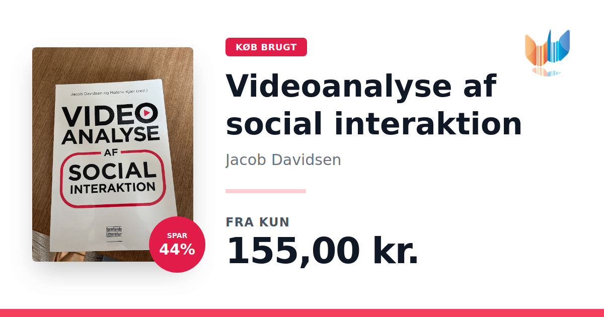 Lige nu kan du købe "Videoanalyse af social interaktion" af Jacob Davidsen til kun 155,00 kr. Du sparer hele 44% af nyprisen! Bogen du ser her er brugt, og i perfekt stand. Vi har i øjeblikket kun et enkelt eksemplar til salg af "Videoanalyse af social interaktion", så slå til mens du kan!