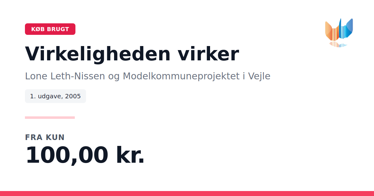 Lige nu kan du købe "Virkeligheden virker" af Lone Leth-Nissen og Modelkommuneprojektet i Vejle til kun 100,00 kr. Bogen du ser her er brugt, og i god stand. Vi har i øjeblikket kun et enkelt eksemplar til salg af "Virkeligheden virker", så slå til mens du kan!