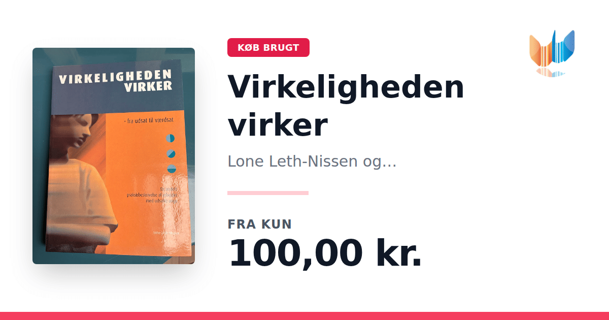 Lige nu kan du købe "Virkeligheden virker" af Lone Leth-Nissen og Modelkommuneprojektet i Vejle til kun 100,00 kr. Bogen du ser her er brugt, og i perfekt stand. Vi har i øjeblikket 2 eksemplarer til salg af "Virkeligheden virker", så husk at se de forskellige udgaver.