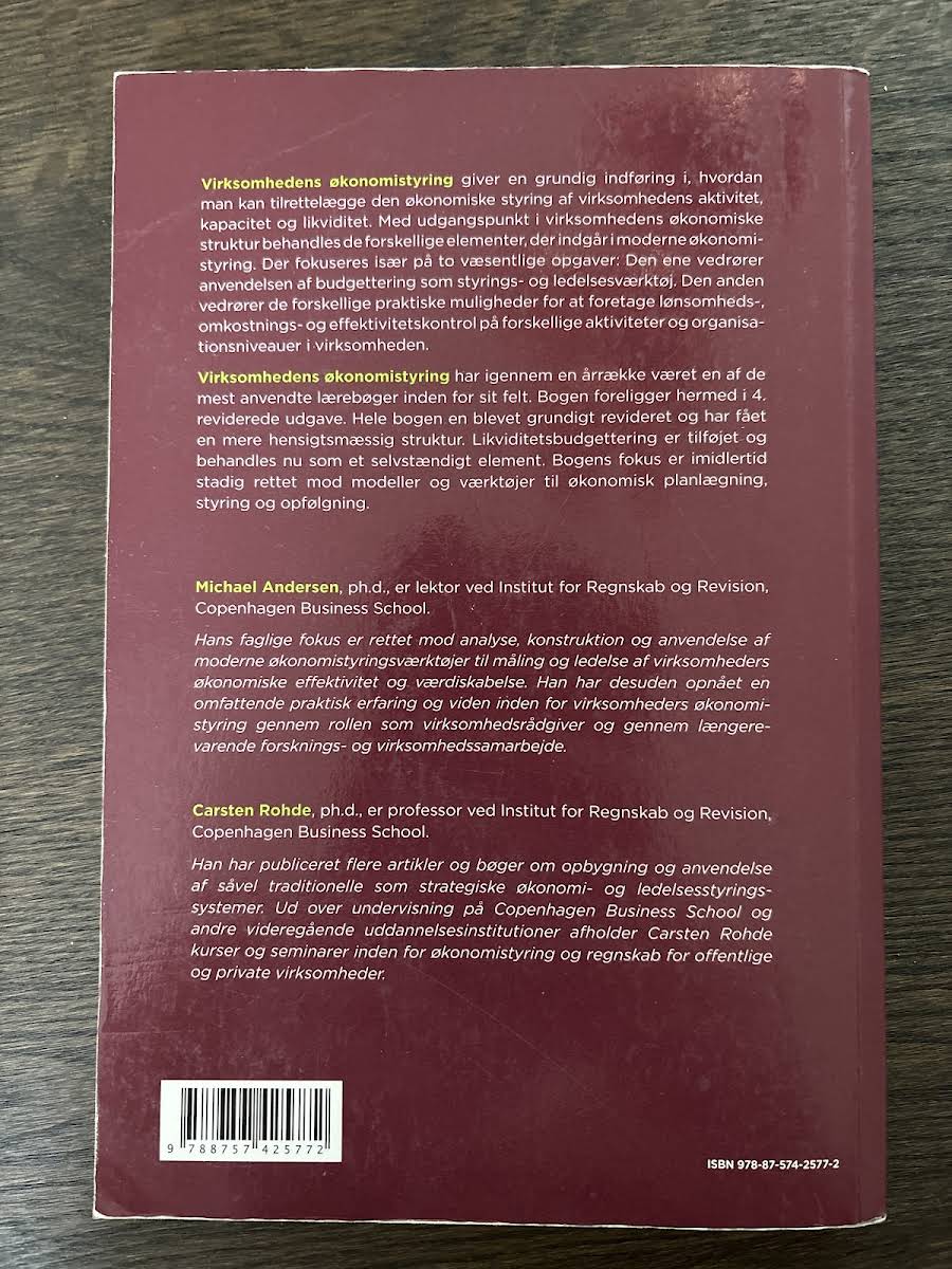 Med sin dybdegående tilgang præsenterer Virksomhedens økonomistyring en grundig indføring i tilrettelæggelsen af den økonomiske styring af virksomhedens kapacitet og aktiviteter. Bogen guider læseren gennem centrale elementer i moderne økonomistyring med særlig fokus på budgettering som et ledelsesværktøj samt anvendelsen af omkostningsregnskabet til at måle effektivitet og fastholde omkostningskontrol. I den 4. reviderede udgave fra maj 2016 er indholdet opdateret med nyt materiale og væsentlige ændringer i strukturen. Ud over en omfattende gennemgang af de traditionelle styringsredskaber introduceres nu også likviditetsbudgettering som et selvstændigt og vigtigt element i den overordnede økonomistyring.