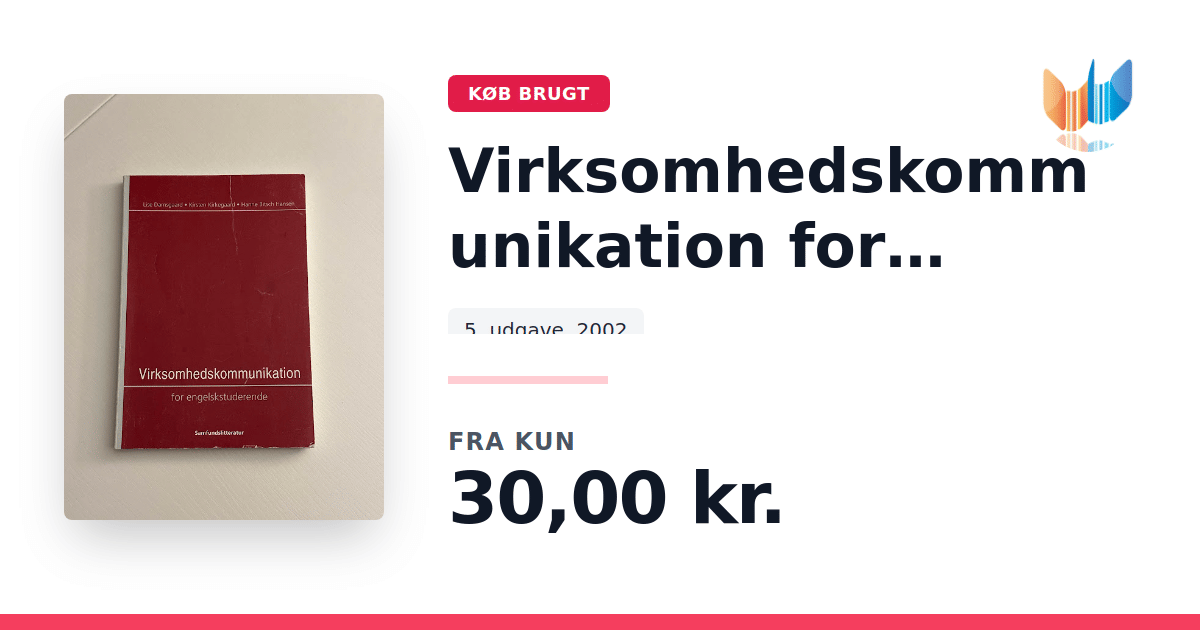 Lige nu kan du købe "Virksomhedskommunikation for engelskstuderende" til kun 30,00 kr. Bogen du ser her er brugt, og i slidt stand. Vi har i øjeblikket kun et enkelt eksemplar til salg af "Virksomhedskommunikation for engelskstuderende", så slå til mens du kan!