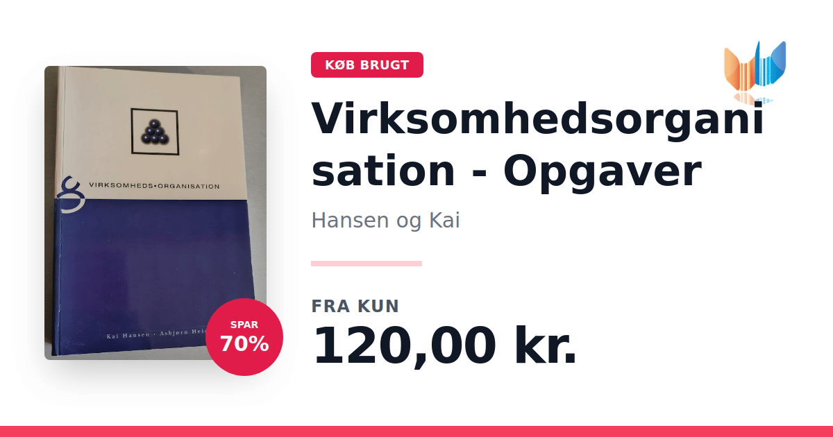 Lige nu kan du købe "Virksomhedsorganisation - Opgaver" af Hansen og Kai til kun 120,00 kr. Du sparer hele 70% af nyprisen! Bogen du ser her er brugt, og i perfekt stand. Vi har i øjeblikket kun et enkelt eksemplar til salg af "Virksomhedsorganisation", så slå til mens du kan!