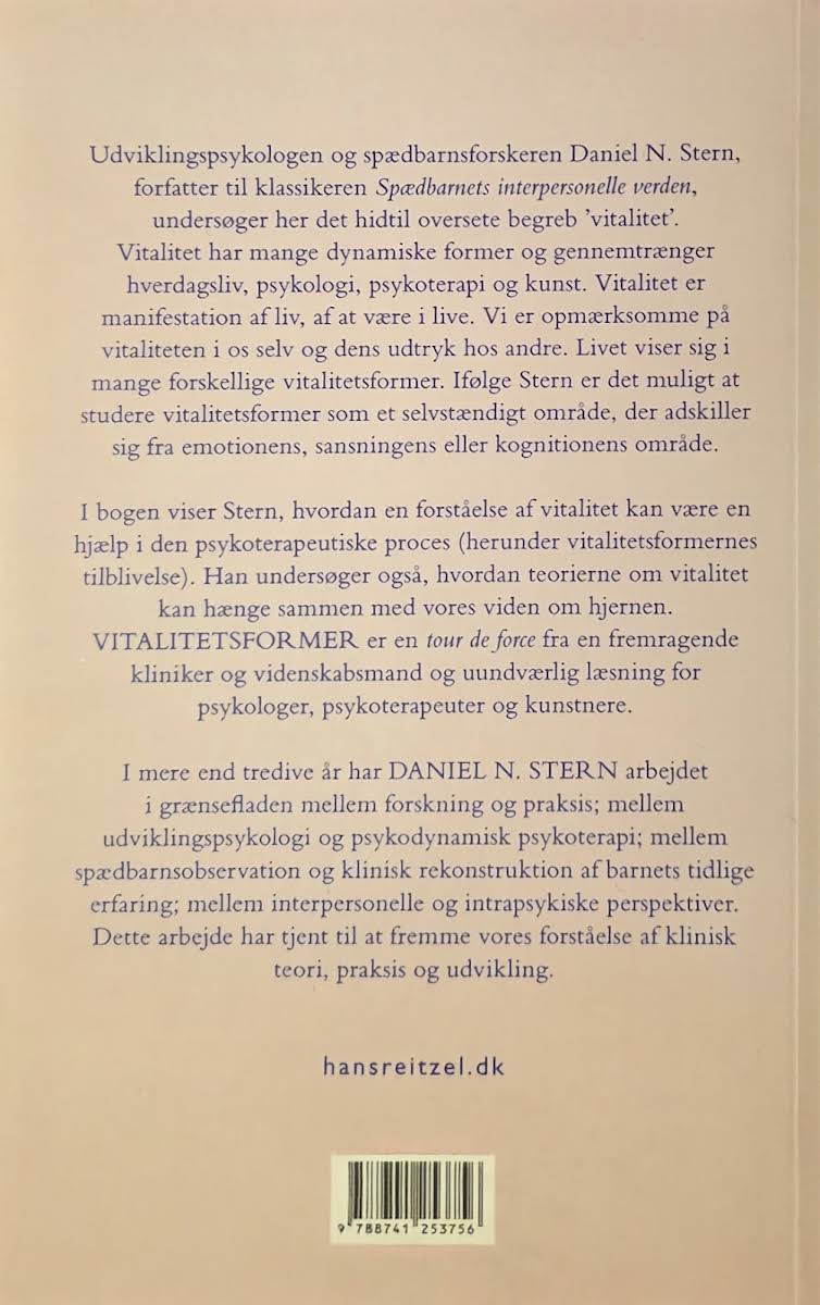Daniel N. Stern udforsker i Vitalitetsformer det dynamiske begreb vitalitet, som gennemsyrer alt fra dagligdags liv til kunstneriske og terapeutiske processer. Han præsenterer vitalitet som den levende kraft i os, der manifesterer sig gennem mange forskellige former – et fænomen, der kan adskilles fra følelser, sansninger og kognition. Stern understreger, at en dybere forståelse af disse vitalitetsformer kan bidrage væsentligt til den psykoterapeutiske praksis, idet den giver indsigt i, hvordan disse former opstår og udvikler sig. Med over tre årtiers erfaring i krydsfeltet mellem forskning og klinisk virkelighed, formår Stern at bringe ny forståelse til både udviklingspsykologi og psykodynamisk psykoterapi. Ved at forbinde teorier om hjernens funktioner med observationer fra spædbarnets første livserfaringer, sætter han fokus på, hvordan livets vitalitet manifesterer sig på en måde, som er til stor nytte for både praktikere og kunstnere. Vitalitetsformer inviterer læseren til at reflektere over den unikke livskraft, der gennemstrømmer alle aspekter af vores eksistens.
