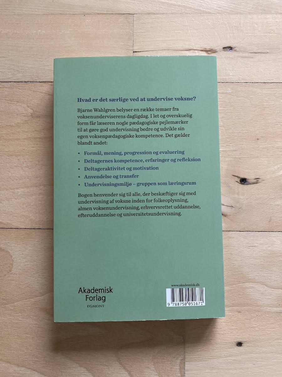 Hvad vil det sige at undervise voksne? I Voksenpædagogik stiller Bjarne Wahlgren skarpt på de temaer, som præger den voksnes læringsproces. Bogen trækker tråde mellem teori og praksis og giver et klart overblik over pædagogiske pejlemærker. Med en let tilgængelig og overskuelig form formidles centrale aspekter som formål, mening, progression og evaluering. Du får indsigt i deltagernes forudsætninger, erfaringer og refleksion samt metoder til at aktivere og motivere. Overførsel af læring til praksis og anvendelse behandles grundigt, ligesom skabelse af et inspirerende læringsmiljø. Hvert tema er understøttet af eksempler, der hjælper dig med at udvikle din egen voksenpædagogiske kompetence. Voksenpædagogik henvender sig til alle, der underviser voksne inden for folkeoplysning, almen voksenundervisning og erhvervsrettet uddannelse. Den er desuden uundværlig for undervisere i efteruddannelse og på universiteter, som ønsker at styrke deres pædagogiske værktøjskasse.
