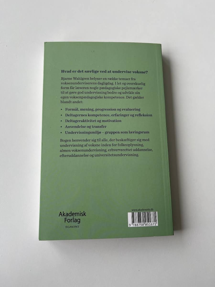 Hvad vil det sige at undervise voksne? I Voksenpædagogik stiller Bjarne Wahlgren skarpt på de temaer, som præger den voksnes læringsproces. Bogen trækker tråde mellem teori og praksis og giver et klart overblik over pædagogiske pejlemærker. Med en let tilgængelig og overskuelig form formidles centrale aspekter som formål, mening, progression og evaluering. Du får indsigt i deltagernes forudsætninger, erfaringer og refleksion samt metoder til at aktivere og motivere. Overførsel af læring til praksis og anvendelse behandles grundigt, ligesom skabelse af et inspirerende læringsmiljø. Hvert tema er understøttet af eksempler, der hjælper dig med at udvikle din egen voksenpædagogiske kompetence. Voksenpædagogik henvender sig til alle, der underviser voksne inden for folkeoplysning, almen voksenundervisning og erhvervsrettet uddannelse. Den er desuden uundværlig for undervisere i efteruddannelse og på universiteter, som ønsker at styrke deres pædagogiske værktøjskasse.