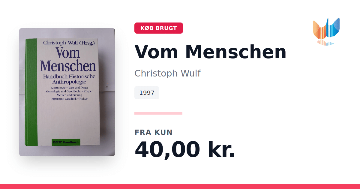 Lige nu kan du købe "Vom Menschen" af Christoph Wulf til kun 40,00 kr. Bogen du ser her er brugt, og i perfekt stand. Vi har i øjeblikket kun et enkelt eksemplar til salg af "Vom Menschen", så slå til mens du kan!