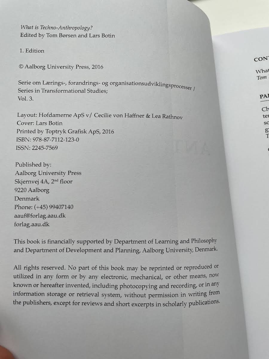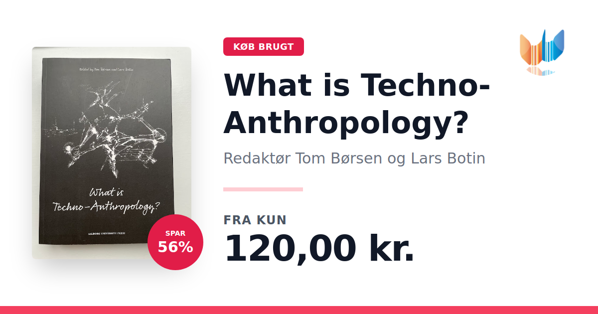 What is Techno-Anthropology? er en antologi redigeret af Tom Børsen og Lars Botin og udgivet af Aalborg Universitetsforlag i 2013. Med sine 483 sider samler værket en række bidrag, der hver især udforsker feltet techno-antropologi fra forskellige vinkler. Techno-antropologi bryder med traditionelle skel mellem mennesker og teknologi samt naturvidenskab og humaniora. Feltet skaber nye perspektiver ved at fokusere på samspillet mellem teknologiske artefakter og deres brugere og ved at bygge bro mellem fagdiscipliner og professionelle praktikker. I bogen præsenteres bl.a. etnografisk feltarbejde i teknologimiljøer, tværfaglige syn på uddannelse, samarbejde og kommunikation, filosofiske analyser og etiske overvejelser omkring nye teknologier. Desuden sættes der fokus på digital antropologi og designmetoder inspireret af antropologisk tænkning. What is Techno-Anthropology? henvender sig til forskere og praktikere inden for antropologi, ingeniørvidenskab, filosofi, design, sociologi, planlægning, undervisning, innovation og beslutningstagning.