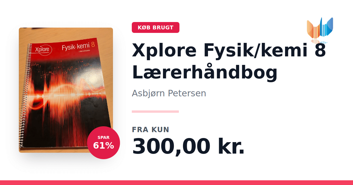 Lige nu kan du købe "Xplore Fysik/kemi 8 Lærerhåndbog" af Asbjørn Petersen til kun 300,00 kr. Du sparer hele 61% af nyprisen! Bogen du ser her er brugt, og i slidt stand. Vi har i øjeblikket 3 eksemplarer til salg af "Xplore Fysik/kemi 8 Lærerhåndbog", så husk at se de forskellige udgaver.