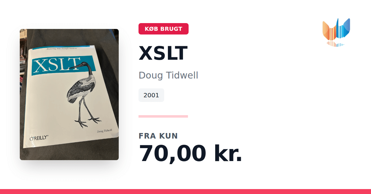 Lige nu kan du købe "XSLT" af Doug Tidwell til kun 70,00 kr. Bogen du ser her er brugt, og i god stand. Vi har i øjeblikket kun et enkelt eksemplar til salg af "XSLT", så slå til mens du kan!