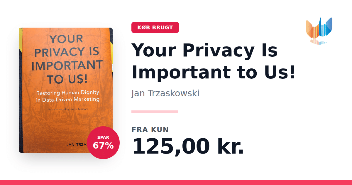Lige nu kan du købe "Your Privacy Is Important to Us!" af Jan Trzaskowski til kun 125,00 kr. Du sparer hele 67% af nyprisen! Bogen du ser her er brugt, og i perfekt stand. Vi har i øjeblikket kun et enkelt eksemplar til salg af "Your Privacy Is Important to Us!", så slå til mens du kan!
