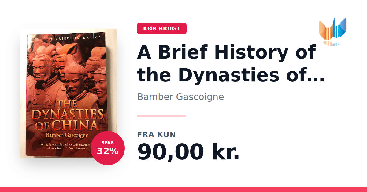 Lige nu kan du købe "A Brief History of the Dynasties of China" af Bamber Gascoigne til kun 90,00 kr. Du sparer hele 32% af nyprisen! Bogen du ser her er brugt, og i perfekt stand. Vi har i øjeblikket kun et enkelt eksemplar til salg af "A Brief History of the Dynasties of China", så slå til mens du kan!