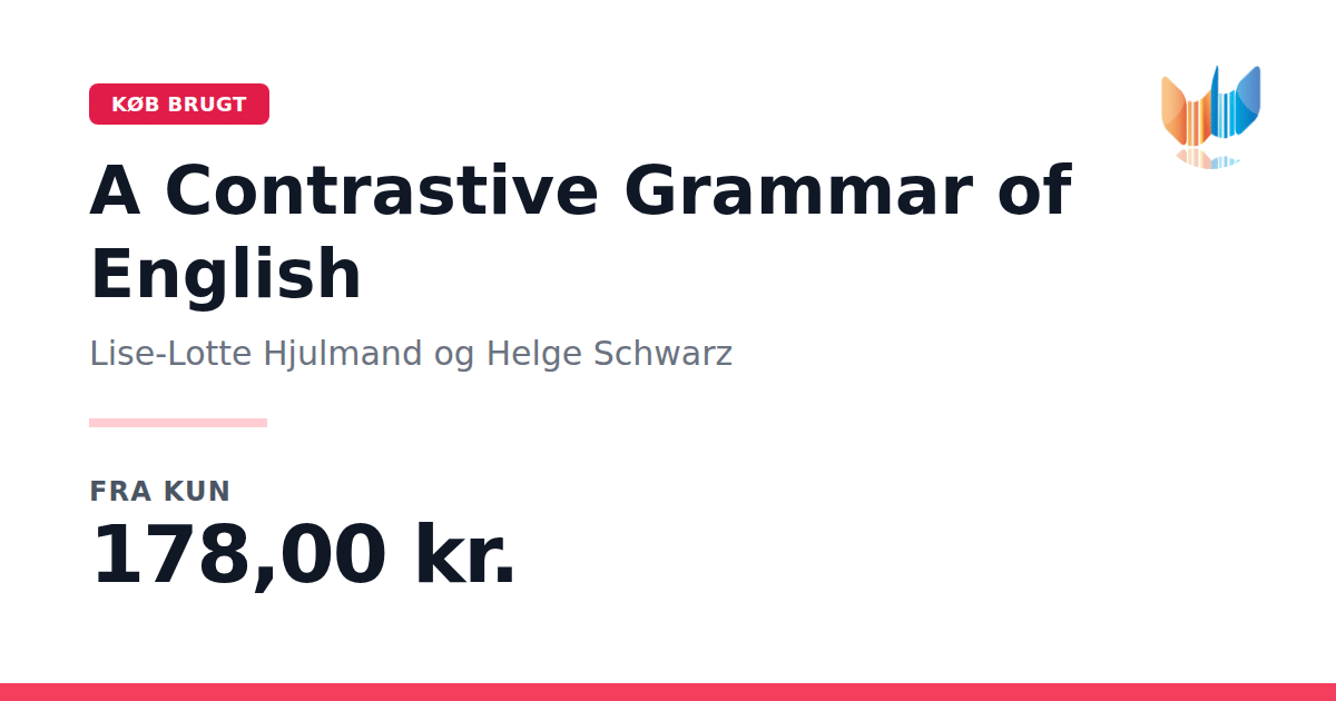 Lige nu kan du købe "A Contrastive Grammar of English" af Lise-Lotte Hjulmand og Helge Schwarz til kun 178,00 kr. Bogen du ser her er brugt, og i perfekt stand. Vi har i øjeblikket 2 eksemplarer til salg af "A Contrastive Grammar of English", så husk at se de forskellige udgaver.