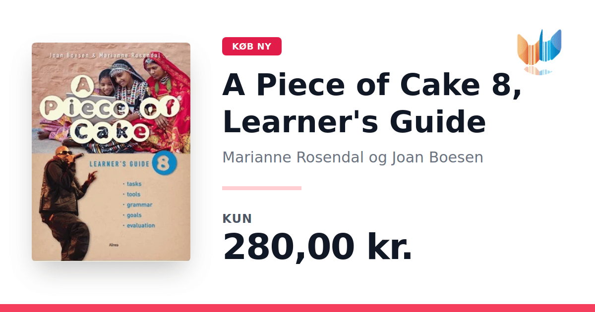 A Piece of Cake 8 Learner’s Guide er en flergangsbog til engelskundervisningen i 8. klasse, udviklet til at styrke elevernes selvstændighed og kommunikative færdigheder. I denne 2. udgave fra 2011 møder de tre hovedsektioner, som tilsammen dækker både opgaveløsning, opslagsværk og grammatisk støtte. Bogens Tasks-afsnit giver eleverne mulighed for at arbejde med alle sproglige kompetencer i hvert kapitel. Hertil følger en oversigt i lærerens guide, som præcist viser, hvilke færdigheder der trænes i de enkelte opgaver. Desuden indeholder Tasks både ekstra Reading comprehension- og Listening comprehension-øvelser, som elevgruppen kan anvende uanset, hvilke tekster de ellers har læst. Tools fungerer som et supplerende opslagsværk, hvor eleverne finder praktiske anvisninger til fx målsætningsarbejde, genreforståelse, fonetik, staveregler og en komplet oversigt over uregelmæssige verber. Afsnittet er oplagt både som forberedelse til lektier og som selvstændig læsning til klassedrøftelse. Grammar er opbygget som et opslagsværk med præcis information om engelsk grammatik, når det kommunikative behov opstår. Sammen med A Piece of Cake’s Correction Key giver det både lærere og elever et effektivt redskab til feedback og genbrug gennem hele skrive- og mundtlige processer. Grammatikafsnittet findes på dansk og engelsk på apieceofcake.alinea.dk og kan medbringes til elevernes afsluttende eksamen.