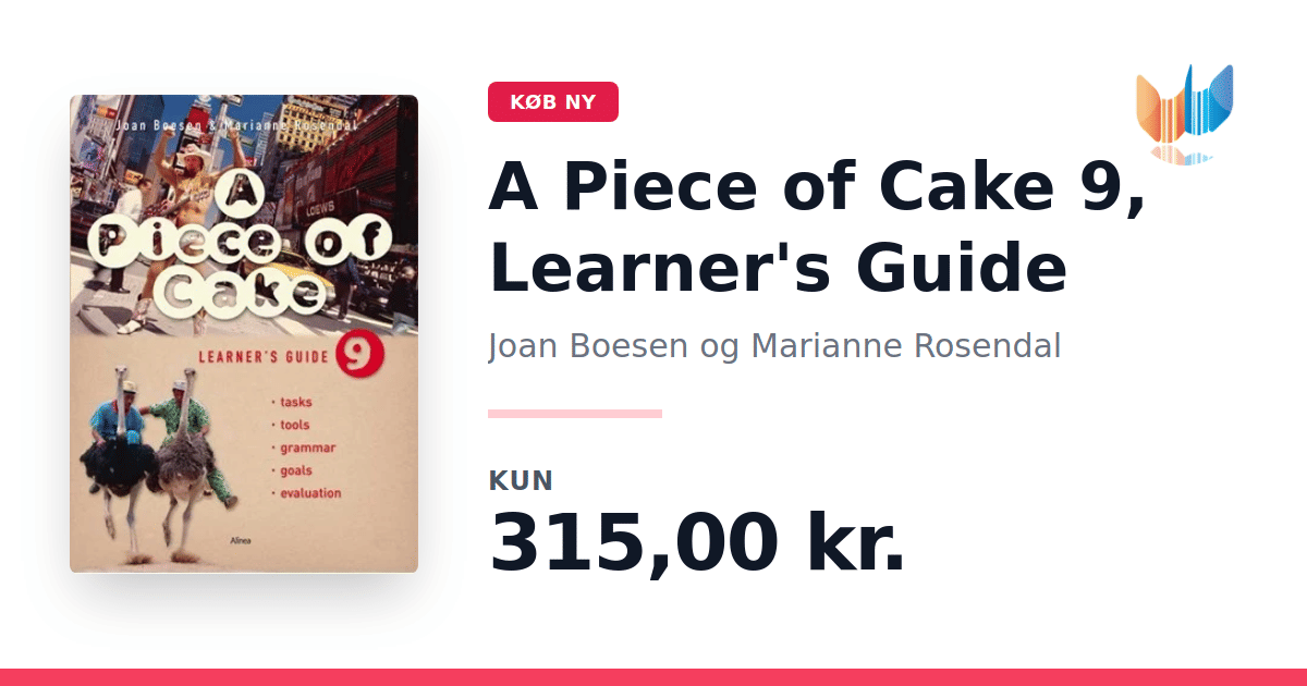 Denne udgave af A Piece of Cake 9 Learner’s Guide er en flergangsbog til engelskundervisningen i 9. klasse, suppleret med online ressourcer. Bogen udgør kernen i A Piece of Cake 9 og er gennemarbejdet, så eleverne kan arbejde både individuelt og i fællesskab med stoffet. Opgaver (Tasks) dækker alle tekster fra Textbook/Web og rummer desuden en Reading comprehension- og en Listening comprehension-øvelse, som alle elever bør løse uanset valg af tekster. Hvert kapitel indeholder opgaver, der styrker alle sproglige færdigheder, og et overskueligt skema i Learner’s Guide viser præcis, hvilke kompetencer der er i fokus. Værktøjer (Tools) samler de hjælpemidler, eleverne behøver for at løse opgaverne i Tasks. Her finder man vejledning i målsætningsarbejde, genreforståelse, fonetik, staveregler samt en liste over uregelmæssige verber. Tools fungerer som et oplagt opslagsværk, og opgaverne henviser hyppigt til relevante afsnit - perfekt til både lektielæsning og fælles klassegennemgang af fx "How to write an article or a letter" og "English spelling rules". Grammatik (Grammar) er udformet som et opslagsværk, der støtter både elever og lærere i feedbackfasen. I stedet for at træne regler uden kontekst læres grammatiske strukturer, når der opstår et kommunikativt behov. Sammen med Correction Key sikrer Grammar, at eleverne hurtigt kan finde og anvende relevante grammatiske paragraffer. Materialet findes på dansk og engelsk online og må tages med til den afsluttende eksamen.