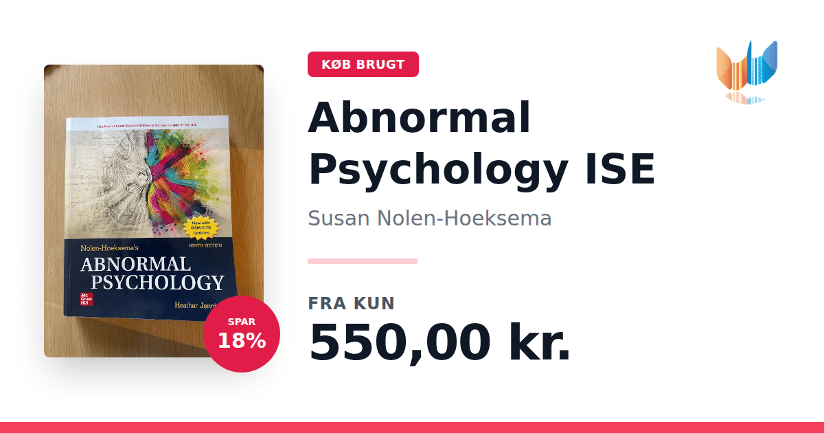 Lige nu kan du købe "Abnormal Psychology ISE" af Susan Nolen-Hoeksema til kun 550,00 kr. Du sparer hele 18% af nyprisen! Bogen du ser her er brugt, og i perfekt stand. Vi har i øjeblikket kun et enkelt eksemplar til salg af "Abnormal Psychology ISE", så slå til mens du kan!