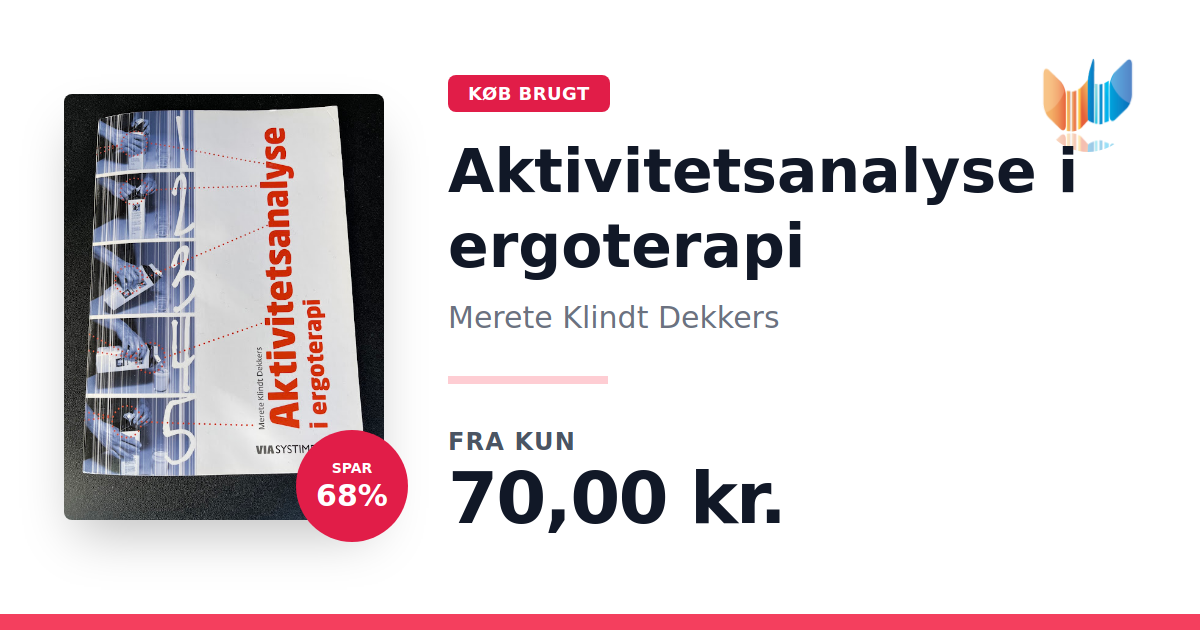 Lige nu kan du købe "Aktivitetsanalyse i ergoterapi" af Merete Klindt Dekkers til kun 70,00 kr. Du sparer hele 68% af nyprisen! Bogen du ser her er brugt, og i perfekt stand. Vi har i øjeblikket kun et enkelt eksemplar til salg af "Aktivitetsanalyse i ergoterapi", så slå til mens du kan!